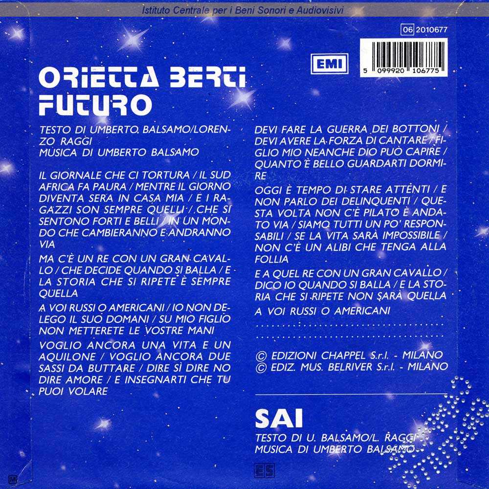 : Data matrici: 31 Gennaio / Lato A: "Festival di Sanremo 1986" / Sul retro di copertina il testo del lato A / Distribuito da EMI Italiana - Caronno Pertusella (Varese)