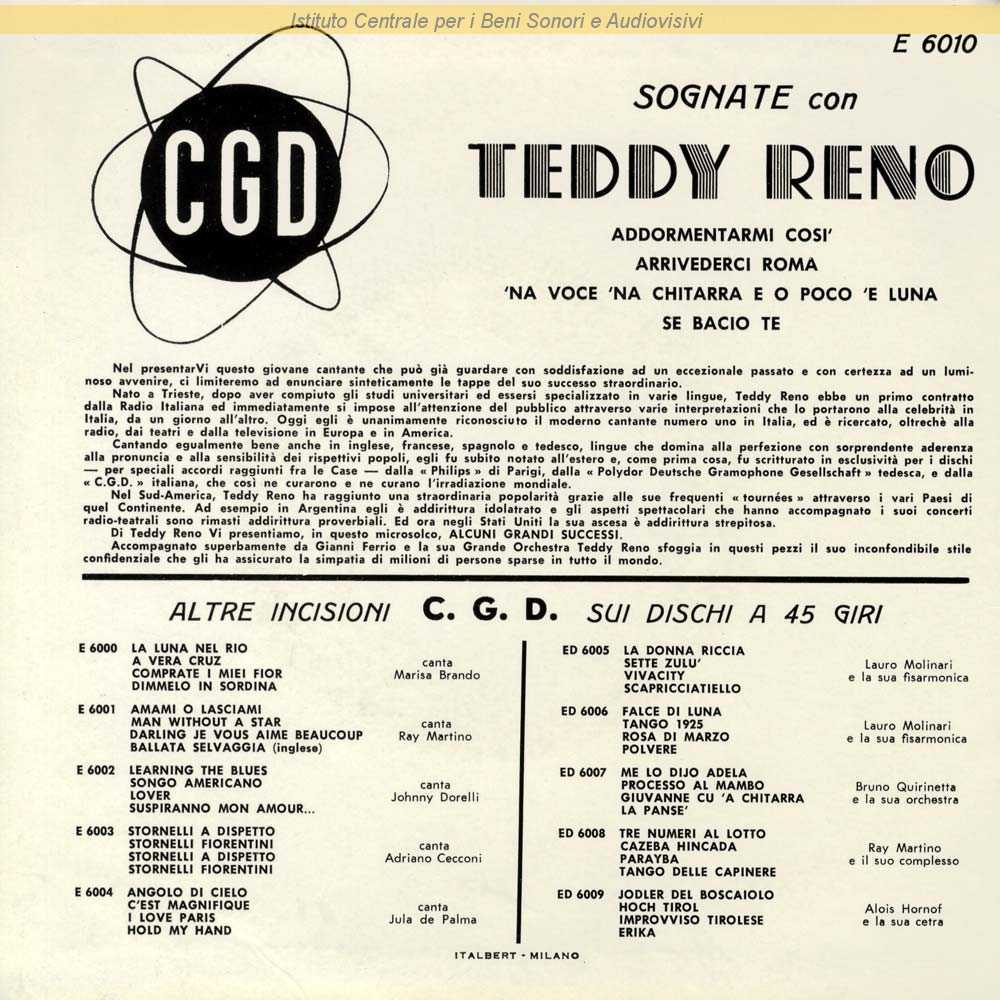 : Data matrici: 26 Gennaio / Teddy Reno e Renato Rascel sono i nomi d'arte rispettivamente di Ferruccio Ricordi e di Renato Ranucci - Biri è lo pseudonimo di Ornella Ferrari / Sul retro di copertina nota di presentazione dell'artista non firmata