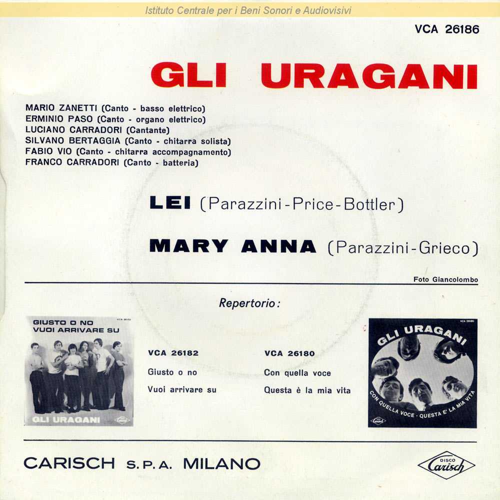 : Data matrici: 24 Marzo-13 Marzo / Fotografia di Giancolombo (Gian Battista Colombo) / Formazione: Franco Carradori - batteria, voce; Luciano Carradori - voce; Silvano Bertaggia - chitarra solista, voce; Erminio Paso - organo, voce; Fabio Vio - chitarra ritmica, voce; Mario Zanetti - basso, voce