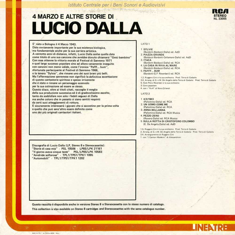 Autori: Lucio Dalla, Paola Pallottino Arrangiatori: Ruggero Cini Edizioni: RCA Musica