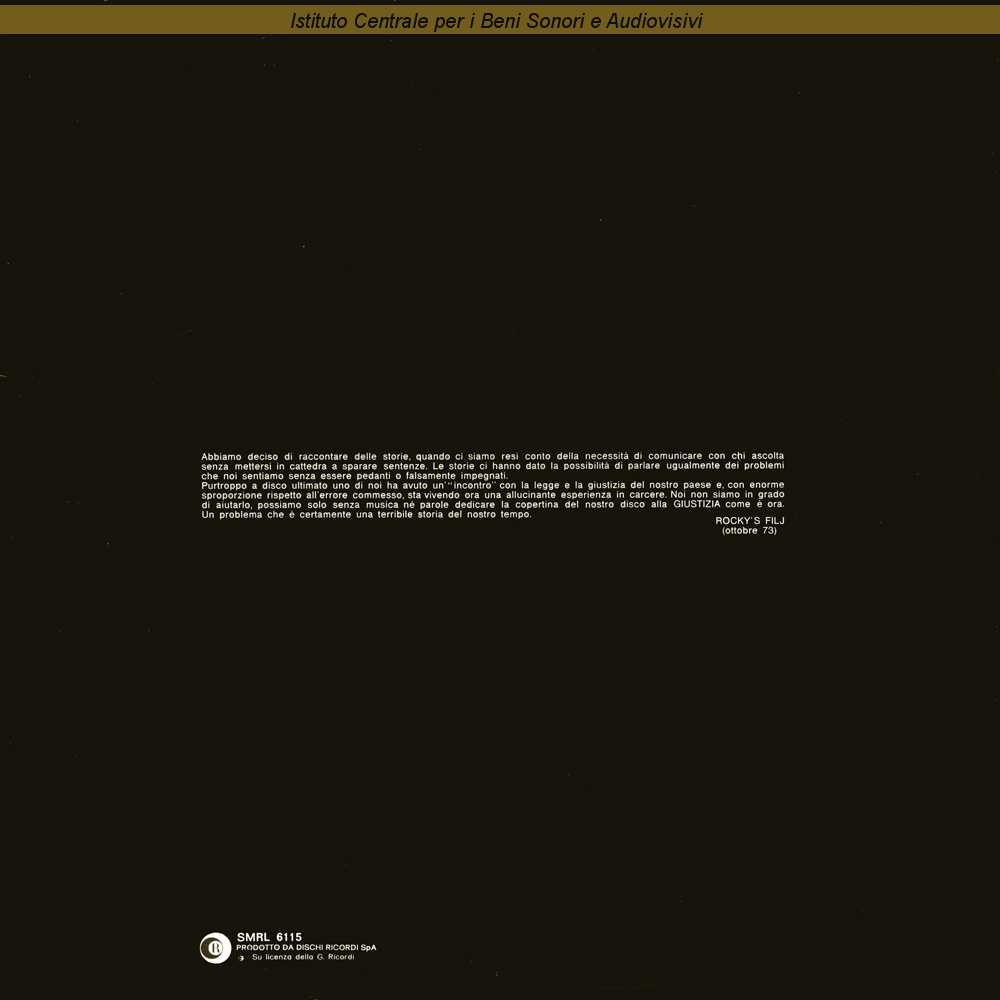 Note: Data matrici: 29 Agosto / Nel retro della busta interna gli autori dei testi e delle musiche vengono indicati come Rocky's Filj mentre in etichetta gli autori sono indicati come Lou Gird e Visir, pseudonimi rispettivamente di Mario Mellier e di Sandro Colombini / Busta interna con logo del gruppo, crediti e testi delle canzoni (vedi link "Altre immagini") / Registrato negli studi Ricordi di Milano da Dino Gelsomino nel Luglio 1973 / Distribuito da Dischi Ricordi - Milano / Formazione: Rubino Colasante - batteria, double bass; Roby Grablovitz - chitarra elettrica, flauto / Rocky Rossi - voce, sassofono alto e baritono, clarinetto; Luigi Ventura - basso, trombone