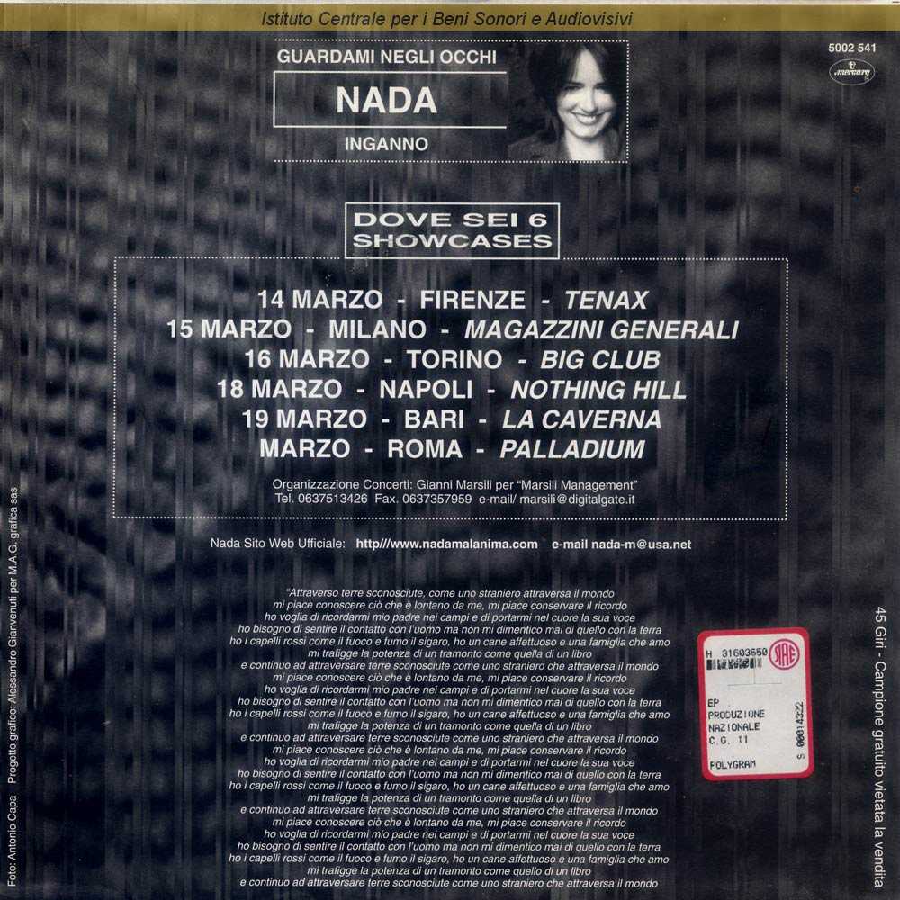 Note: Disco promozionale non destinato alla vendita / Produzione esecutiva di Marcello Villella - Coordinamento artistico di Gerri Manzoli / Sul retro di copertina un testo non firmato ma attribuibile all'artista / Fotografia di Antonio Capa - Grafica di Alessandro Gianvenuti /Distribuito da PolyGram - Milano