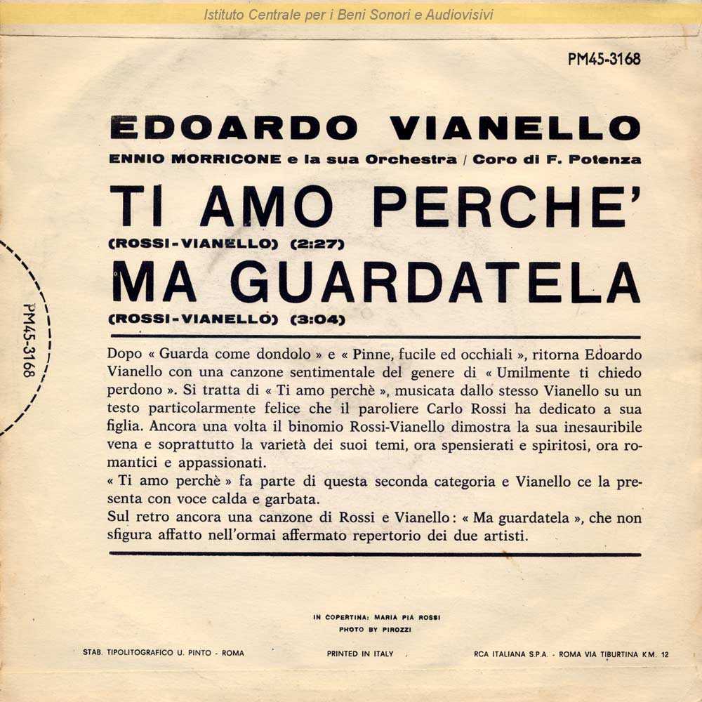 Note: In copertina una fotografia di Maria Pia Rossi, figlia di Carlo Rossi, di Giacomo R. Pirozzi - Sul retro di copertina presentazione del disco non firmata / In copertina come etichetta è indicata RCA Italiana e non RCA Victor / Distribuito da RCA Italiana - Roma