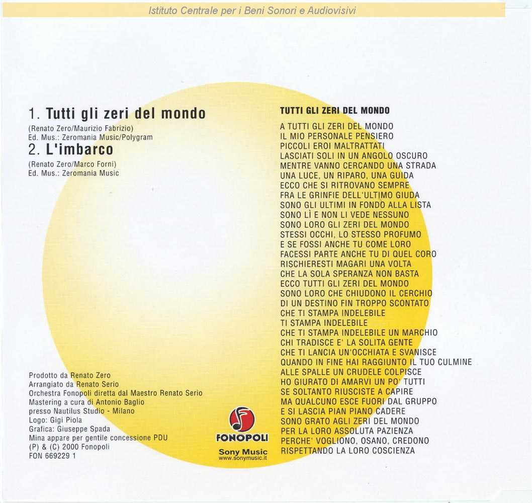 : "L'imbarco" è un brano strumentale / Sul retro di copertina il testo di "Tutti gli zeri del mondo" / Grafica di Giuseppe Spada - Logo di Fonopoli di Gigi Piola / Distribuito da Sony Music Entertainment (Italy) - Milano