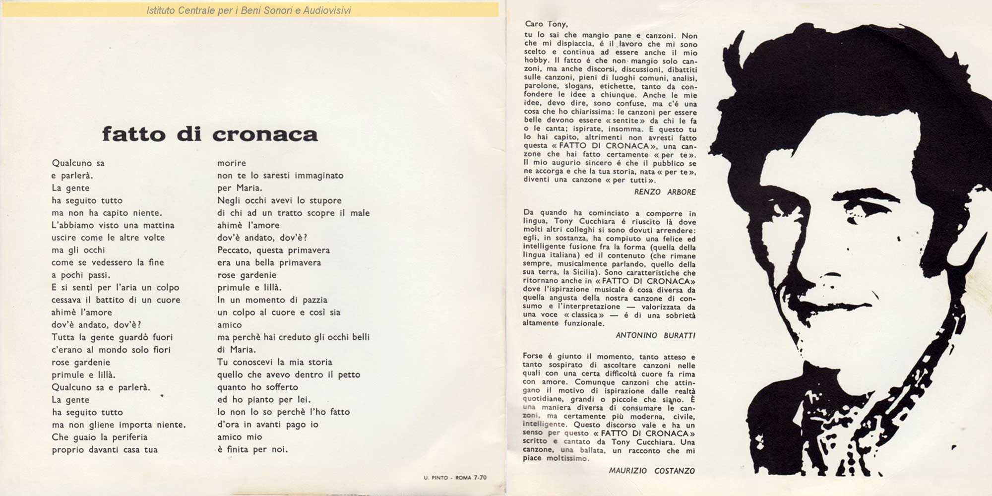 Note: In copertina la dicitura Omicron Serie People fa riferimento alla etichetta della prima stampa del disco (Novembre 1970) / Copertina apribile a libretto con all'interno il testo del lato A e tre brevi presentazioni del disco firmate da Renzo Arbore, Antonino Buratti e Maurizio Costanzo
