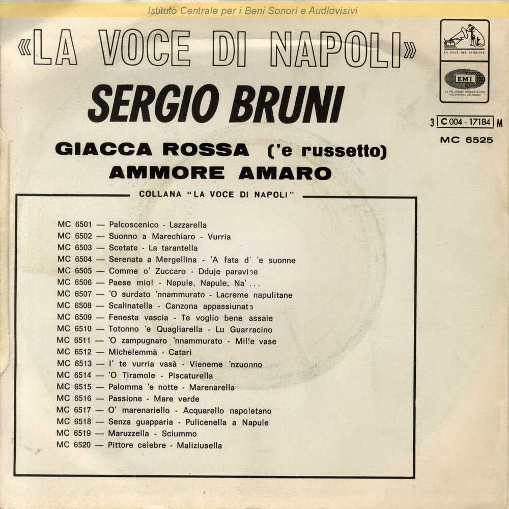 : Data matrici: 16 febbraio / Sergio Bruni è il nome d'arte di Guglielmo Chianese - Nisa è lo pseudonimo di Nicola Salerno - Il vero cognome di Renato Carosone è Carusone / Ristampa nella collana "La Voce di Napoli" con doppia numerazione