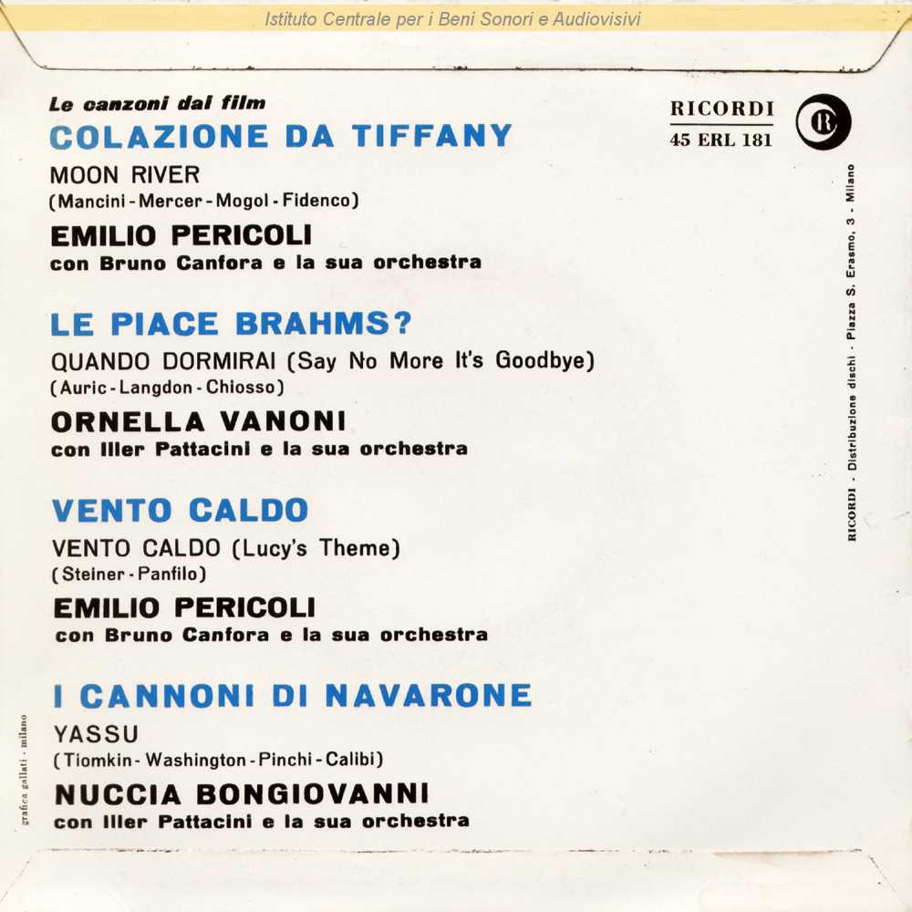 Interpreti: Emilio Pericoli Autori: Nico Fidenco, Henry Mancini, Johnny Mercer, Mogol Orchestra: Bruno Canfora