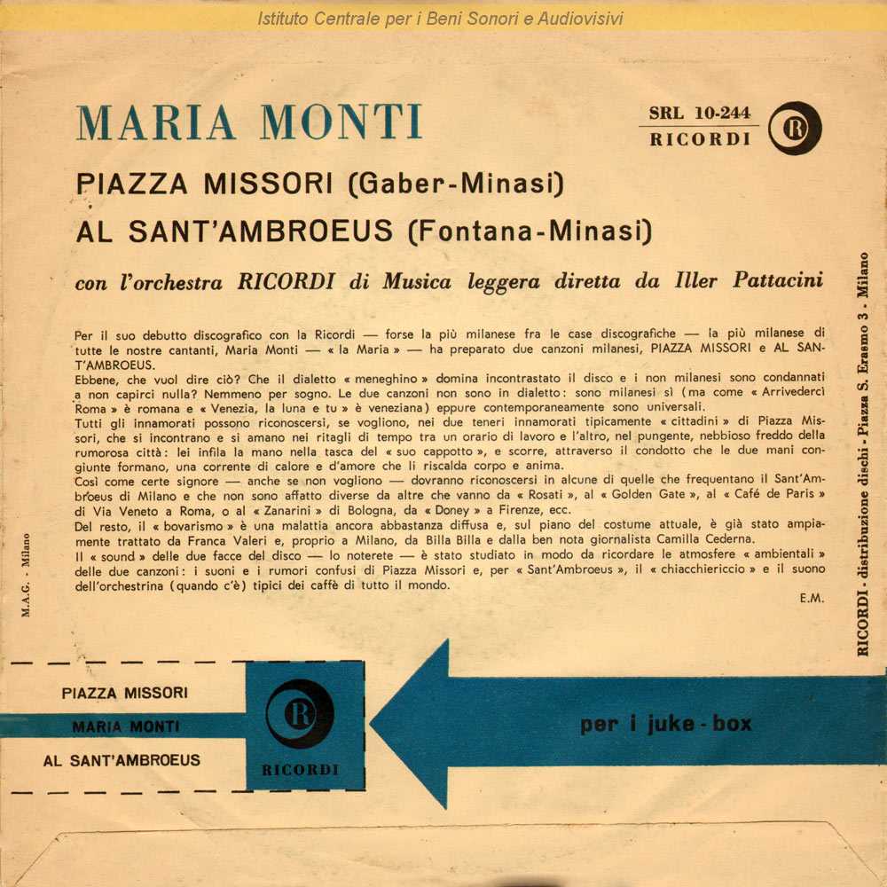 : Data matrici: 6 Aprile / Maria Monti è il nome d'arte di Maria Monticelli / Sul retro di copertina presentazione del disco di Vincenzo Micocci (E.M.) / Distribuito da Dischi Ricordi - Milano