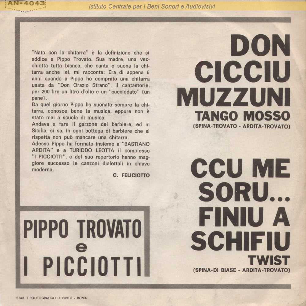 : Inciso come Pippo Trovato e i Picciotti / Sul retro di copertina presentazione del disco firmata Carmelo Feliciotto / Distribuito da RCA Italiana - Roma / Formazione: Bastiano Ardita, Turiddo Leotta, Pippo Trovato