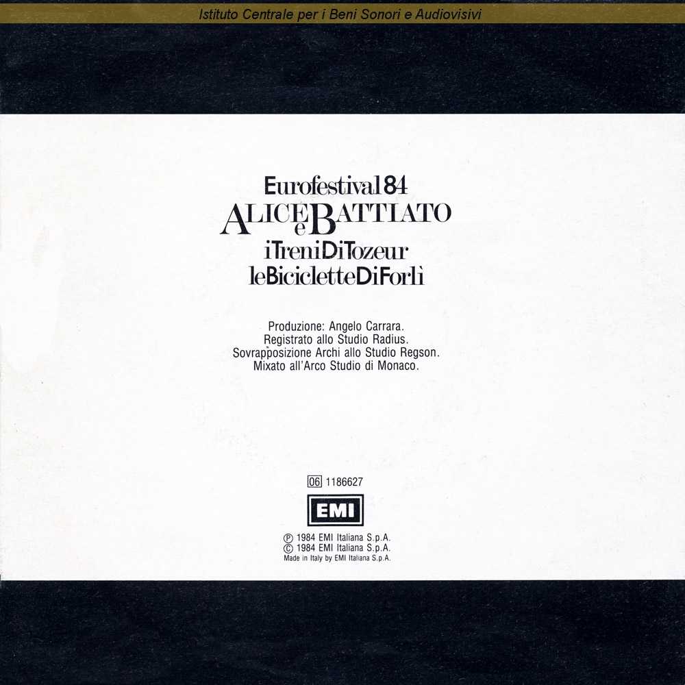 Note: Data matrici: 2 Aprile / Lato A: "Eurofestival 1984" - Il lato B è strumentale / Alice Visconti e Alice sono nomi d'arte di Carla Bissi / Registrato allo Studio Radius di Milano - Archi registrati allo Studio Regson di Milano - Mixato all'Arco Studio di Monaco / Distribuito da EMI Italiana - Caronno Pertusella (Varese)