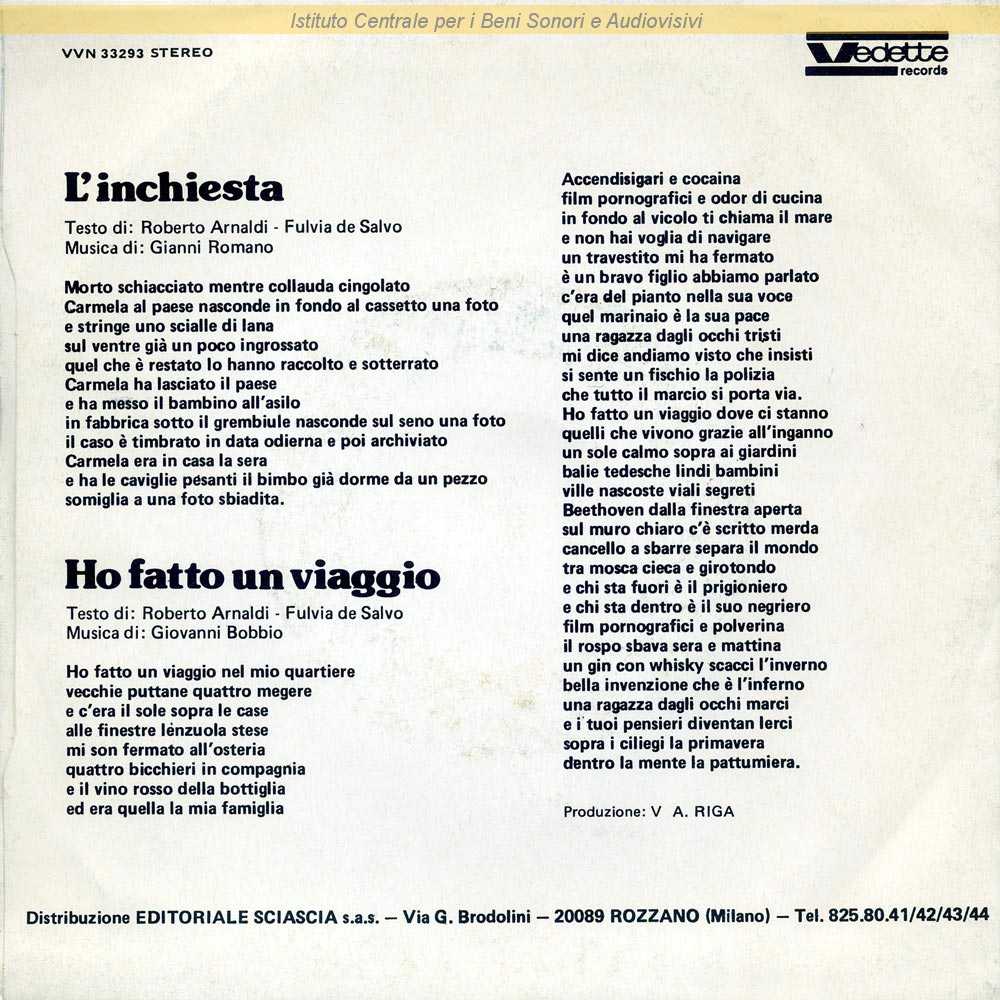 Note: Data matrici: 7 Ottobre / Sul retro di copertina compaiono i testi delle due canzoni, ma con i crediti d'autore invertiti e con l'indicazione, per tutti e due i brani, di Fulvia de Salvo come co-autrice, che però non compare in etichetta / Distribuito da Editoriale Sciascia - Rozzano (Milano)