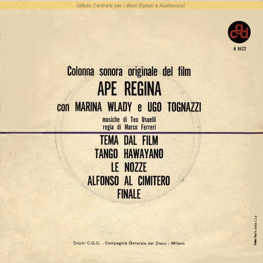 Note: Data matrici: 10 Gennaio / Dalla colonna sonora originale del film "Una storia moderna - L'ape Regina" (Marco Ferreri, 1963) /Pur non essendoci alcuna evidenza nč in copertina nč in etichetta l'interprete, cosė come la direzione dell'orchestra, sono attribuibili a Teo Usuelli