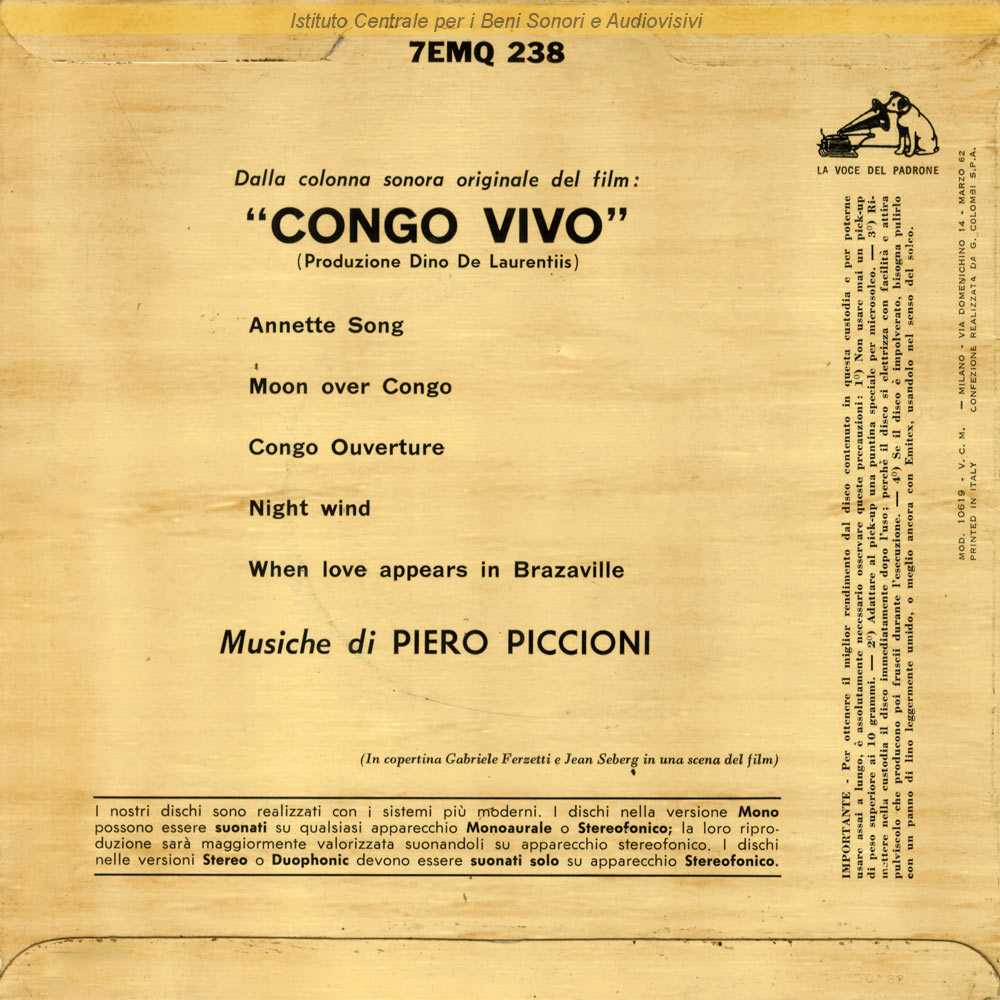 : Data matrici: 20 Marzo / Dalla colonna sonora originale del film "Congo Vivo" (Giuseppe Bennati, 1962) / Distribuito da EMI Italiana - Milano