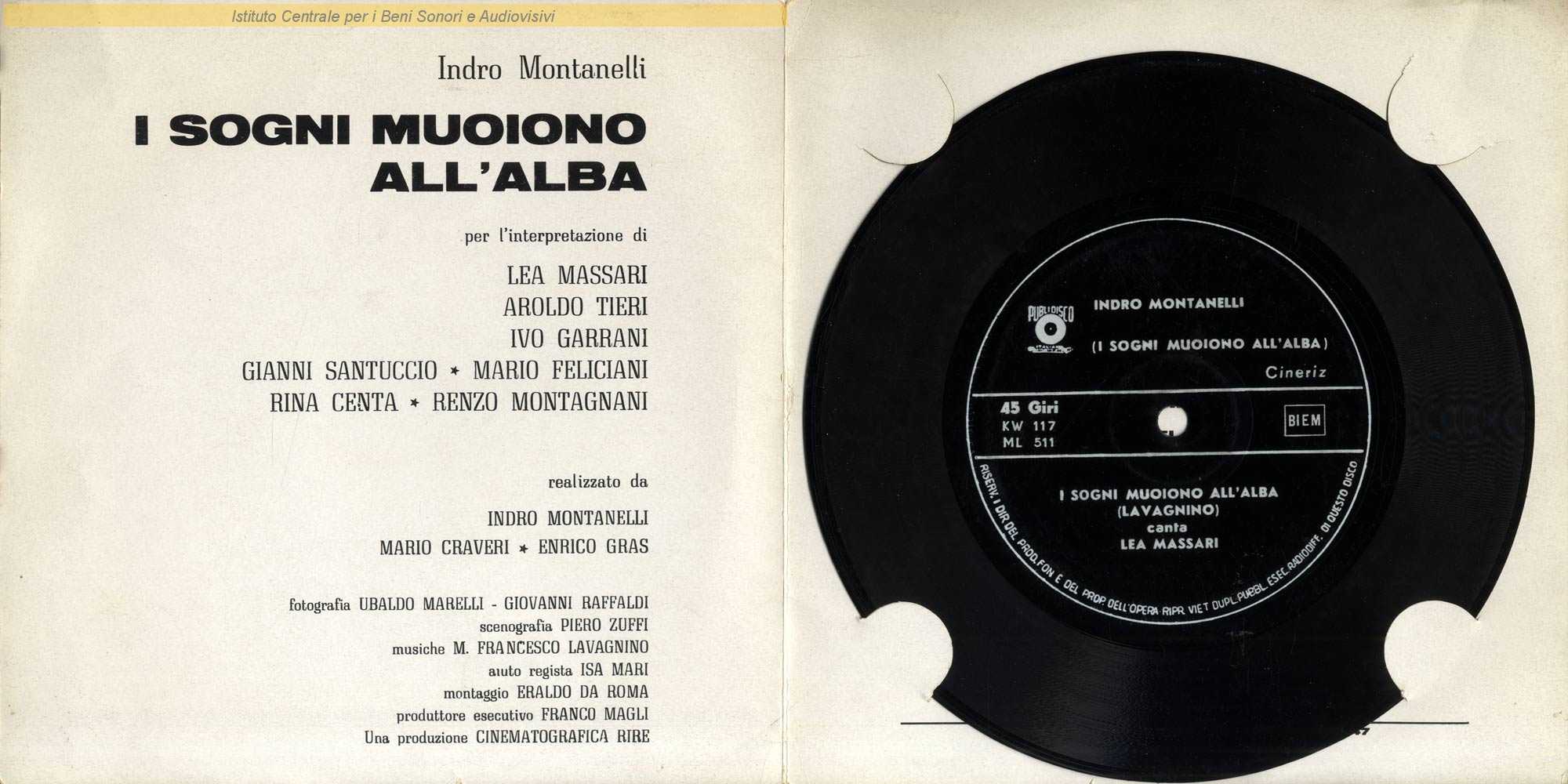 Note: Dal film "I sogni muoiono all'alba" (Mario Craveri/Enrico Gras/Indro Montanelli, 1961) / Copertina apribile e non saldato sul lato superiore e inferiore, con alloggio per ospitare il disco flexi - Probabilmente distribuita in omaggio agli spettatori della prima proiezione del film / Sotto il flexi riferimento alla emissione ufficiale su vinile della RCA (vedi link "Altre immagini")