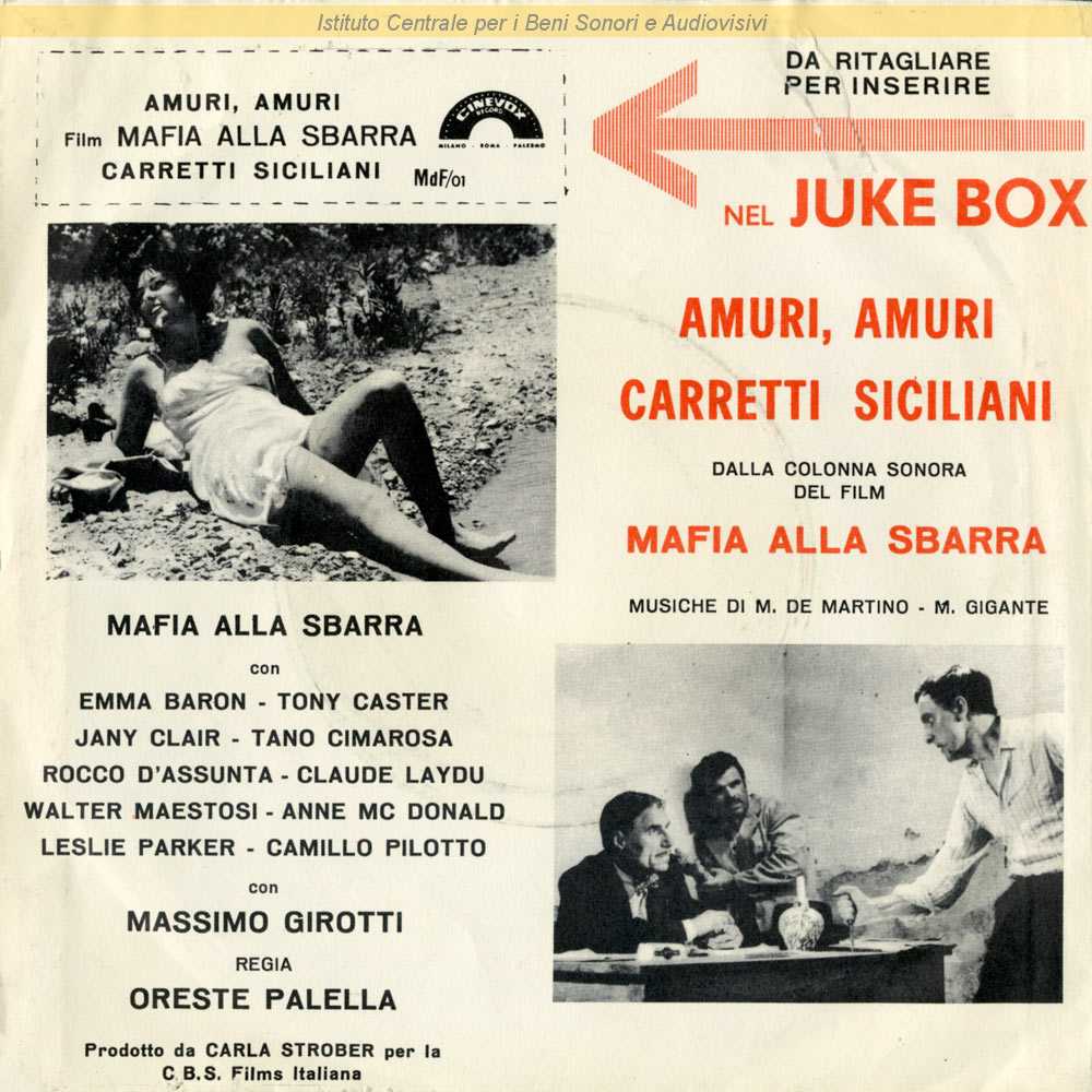: In mancanza di indicazioni sia in copertina che in etichetta si attribuisce paternità del disco e direzione d'orchestra al Maestro Marcello De Martino / Dalla colonna sonora del film "Mafia alla sbarra" (Oreste Paolella, 1963)