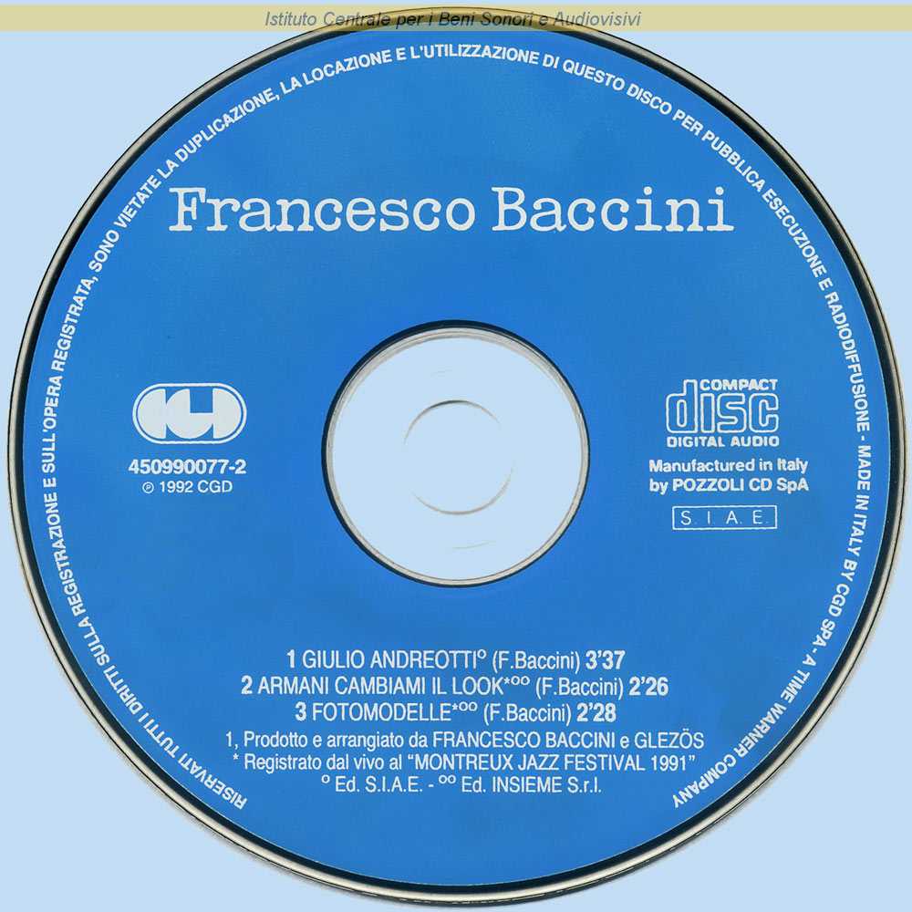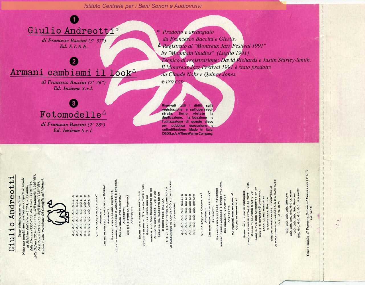 : Sul retro di copertina il testo della canzone "Giulio Andreotti" / "Armani cambiami il look" e "Fotomodelle" registrato al Montreaux Jazz Festival nel luglio 19919 da David Richards e Justin Shirley-Smith al Mountain Studios