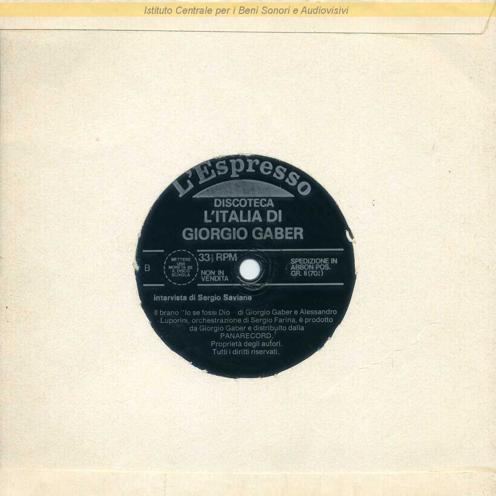 Note: Disco flexi a due facciate allegato al n. 21 del settimanale L'Espresso del 31 Maggio 1981 / Giorgio Gaber è intervistato dallo scrittore Sergio Saviane / Nel corso dell'intervista viene proposta, divisa in brevi frammenti musicali, la canzone "Io se fossi Dio" di Giorgio Gaber e Sandro Luporini, con orchestrazione di Sergio Farina, prodotta da Giorgio Gaber e distribuita da Panarecord