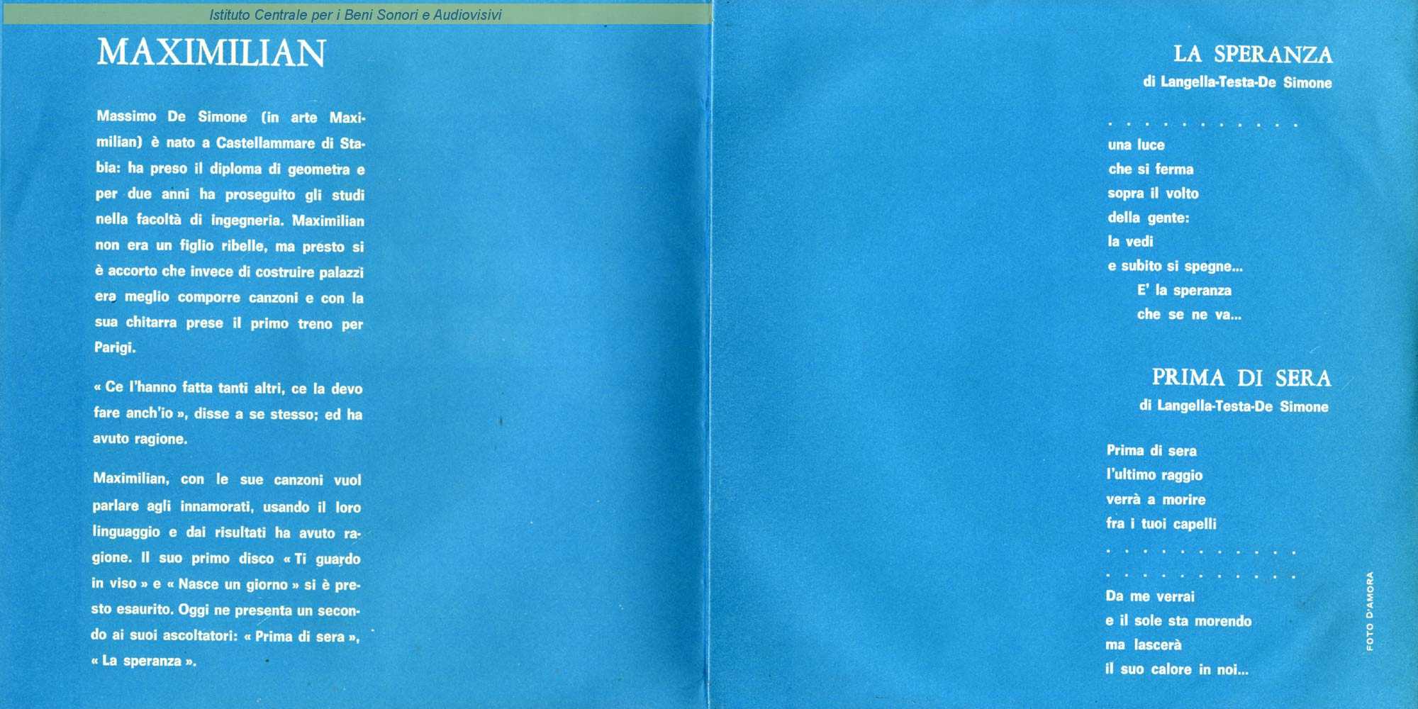 : Maximilian è il nome d'arte di Massimo De Simone / Copertina apribile a libretto con all'interno breve scheda sull'artista non firmata e due brevi estratti dal testo delle due canzoni - Grafica di Daniele Usellini - Fotografia di D'Amora