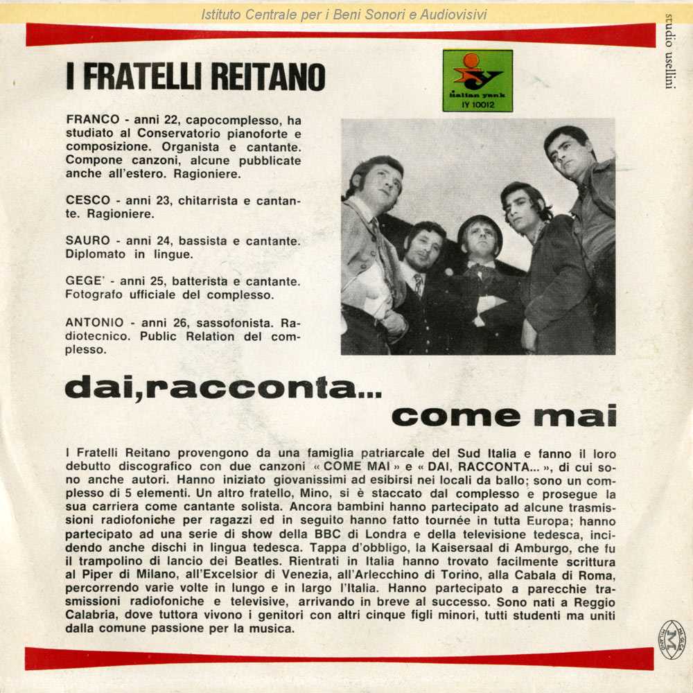 Note: Data matrici: 20 Maggio / Sul retro di copertina breve nota non firmata di presentazione del gruppo / Copertina di Daniele Usellini / Formazione: Antonio Reitano - sassofono; Francesco Reitano - chitarre, voce; Franco Reitano - tastiere, voce; Gegè Reitano - batteria, voce; Sauro Reitano - basso, voce
