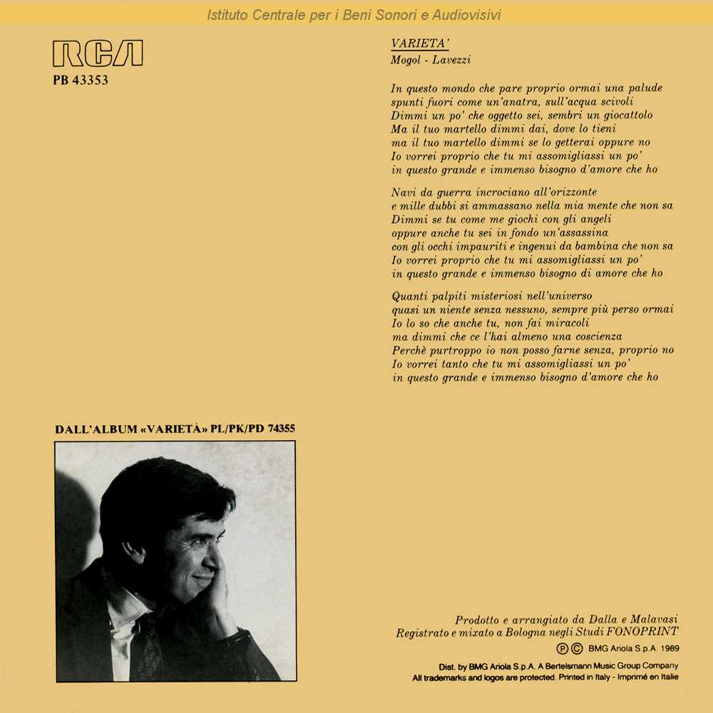 : Sul retrocopertina riprodotto il testo di "Varietà" / Registrato e mixato negli studi Fonoprint di Bologna / Distribuito da BMG Ariola - Roma