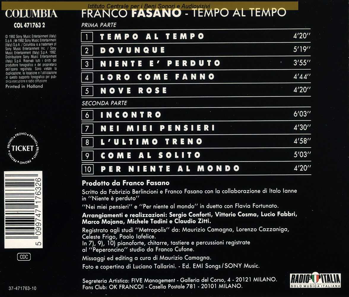 Autori: Fabrizio Berlincioni, Franco Fasano, Italo Janne Musicisti: Marco Ambrosini (oboe) , Marco Ambrosini (corno inglese) , Giuseppe Bonandrini (clarinetto) , Maurizio Camagna (programmazione tastiere) , Edoardo De Angelis (violino) , Luca Di Gioia (violino) , Emilio Eria (viola) , Lucio Fabbri (tastiere) , Fabrizio Fabiano (violoncello) , Franco Fasano (tastiere) , Paola Guerri (viola) , Roberto Lucano (violino) , Roberto Politti (violoncello) , Francesco Saverio Porciello (chitarra classica) , Alessandro Simonetto (fisarmonica) , Alberto Spagnoli (violino) Orchestra: Lucio Fabbri Edizioni: EMI Songs , Sony Music , Blue Team