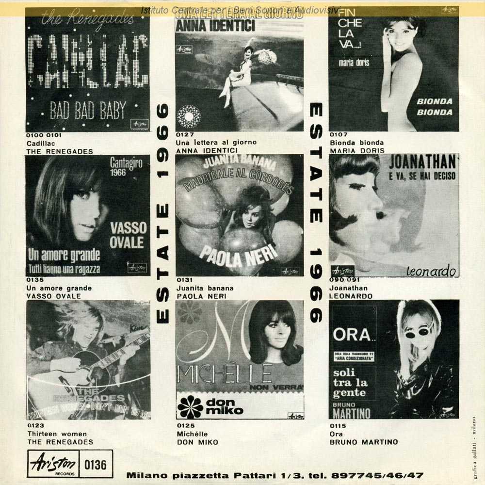 : Lato A: "Cantagiro 1966" / Nisa è lo pseudonimo di Nicola Salerno / Copertina di Bonazzi e Mario Convertino / Formazione: Claudio Benassi - batteria; Italo Ferrari - basso; Fabrizio Levati - chitarra; Angelo Ravasini - voce, chitarra
