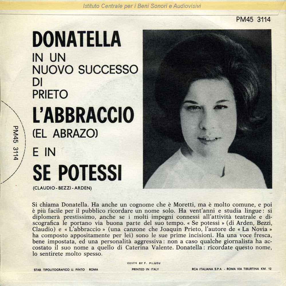 Note: Inciso come Donatella / Lato A: "Cantagiro 1962" / Arden è lo pseudonimo di Carlo Scartocci / In etichetta non è riportato l'autore del testo italiano di "L'abbraccio" che in una successiva ristampa su cd risulta essere Sergio Bardotti / Copertina di Ferruccio Piludu - Sul retro copertina breve presentazione del disco non firmata / Distribuito da RCA Italiana - Roma