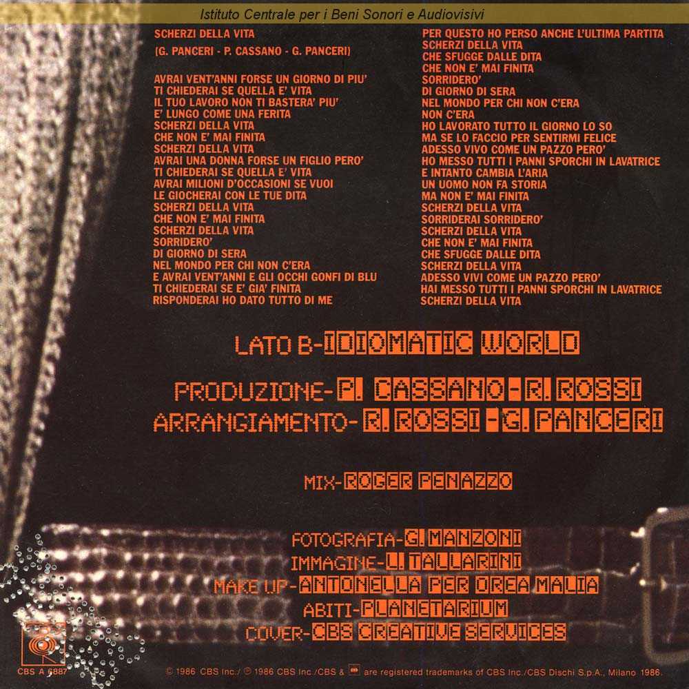 Note: Data matrici: 14 Gennaio / Inciso come Gigi Panceri / Lato A: "Festival di Sanremo 1986" / Sul retro copertina riprodotto il testo del lato A / Fotografia di Giovanni Manzoni - Immagine di Luciano Tallarini / Mix di Roger Penazzo / Distribuito da CBS Dischi - Milano