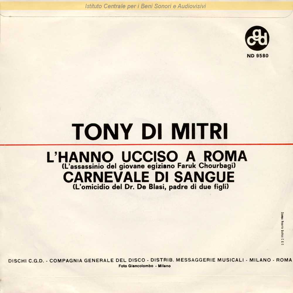 Note: Data matrici: 6 luglio / Sottotitolo del lato A: "L'assassinio del giovane egiziano Faruk Chourbagi" - Sottotitolo del lato B: "L'omicidio del Dr. De Blasi, padre di due figli" / Fotografia di Giancolombo (Gian Battista Colombo) / Distribuito da Messaggerie Musicali - Milano