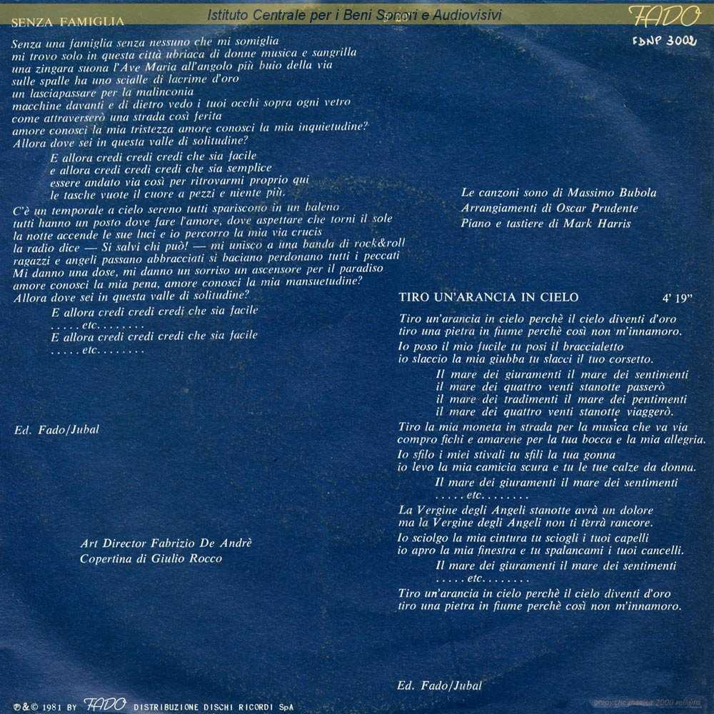 : Data matrici: 21 Maggio / Art director: Fabrizio De André - Copertina di Giulio Rocco / Distribuito da Dischi Ricordi - Milano