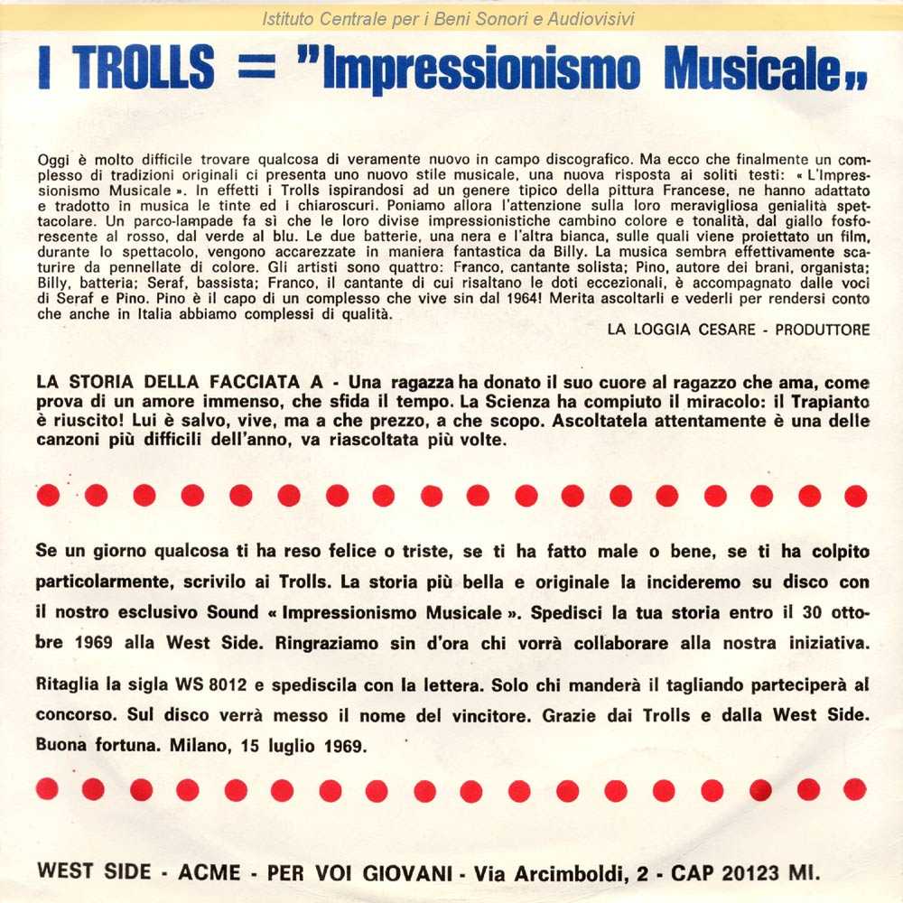 Note: Sottotitolo lato A: Dedicato alle Puglie - Sottotitolo lato B: Dedicato alla Lombardia / Sul retro di copertina nota di presentazione del disco e del gruppo firmata da Cesare La Loggia / Formazione: Billy Calati -batteria; Franco - voce solista; Pino Scarpettini - organo,voce; Seraf - basso e voce