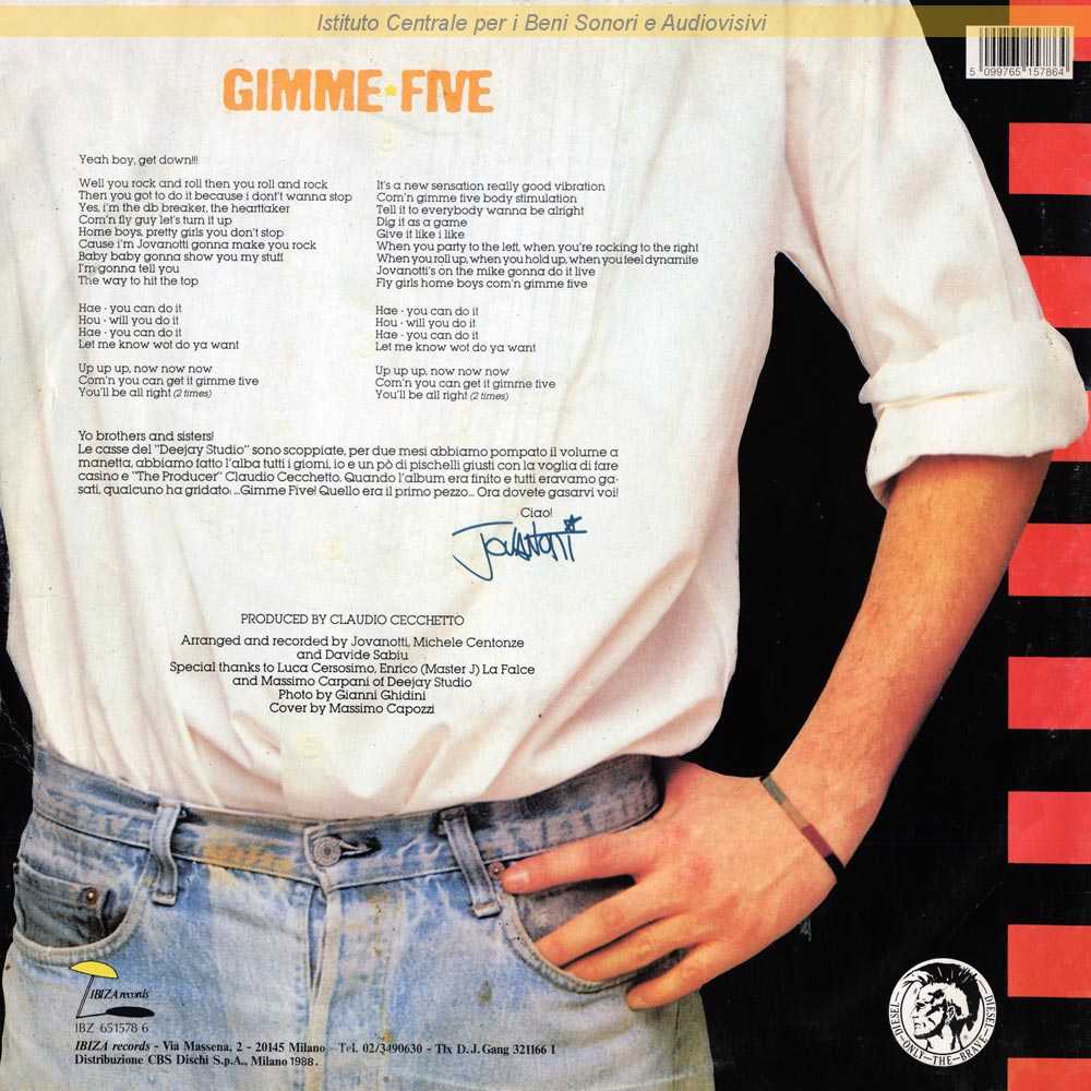 Note: Sul retro copertina il testo della canzone ed una breve presentazione del disco firmata da Jovanotti / Fotografia di Gianni Ghidini - Copertina di Massimo Capozzi / Etichetta Ibiza Records personalizzata (vedi link "Altre immagini") / Registrato da Jovanotti, Michele Centonze e Davide Sabiu - Missato al Medicina Studio da Mirko Bezzi e Jovanotti / Distribuito da CBS Dischi - Milano
