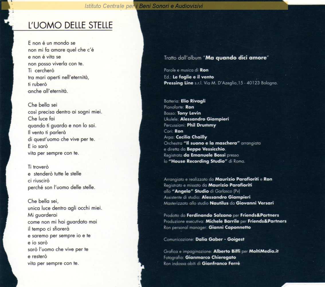 Note: "L'uomo delle stelle": "Festival di Sanremo 2006" / Sul retro di copertina il testo della canzone / Fotografia di Gianmarco Chiaregato - Grafica di Alberto Biffi / Registrato e mixato presso l'"Angelo Studio" di Garlasco (Pavia), da Maurizio Parafioriti - L'Orchestra "Il suono e la maschera" registrata presso lo "House Recording Studio" di Roma da Emanuele Bossi / Distribuito da Sony BMG Music Entertainment