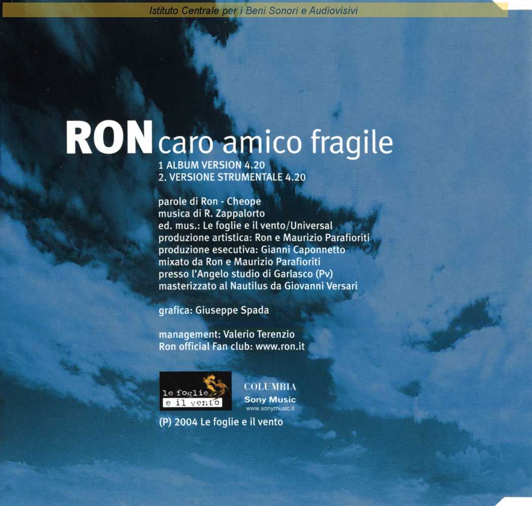 Note: Produzione esecutiva di Gianni Caponnetto / Grafica di Giuseppe Spada / Mixato da Ron e Maurizio Parafioriti presso l'"Angelo Studio" di Garlasco (PV) / Distribuito da Sony Music Entertainment - Milano