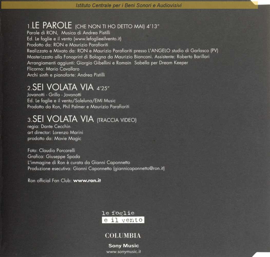 Autori: Lorenzo Cherubini, Orazio Grillo Produttori: Phil Palmer, Maurizio Parafioriti, Ron Edizioni: Le foglie e il vento , Soleluna , EMI Music