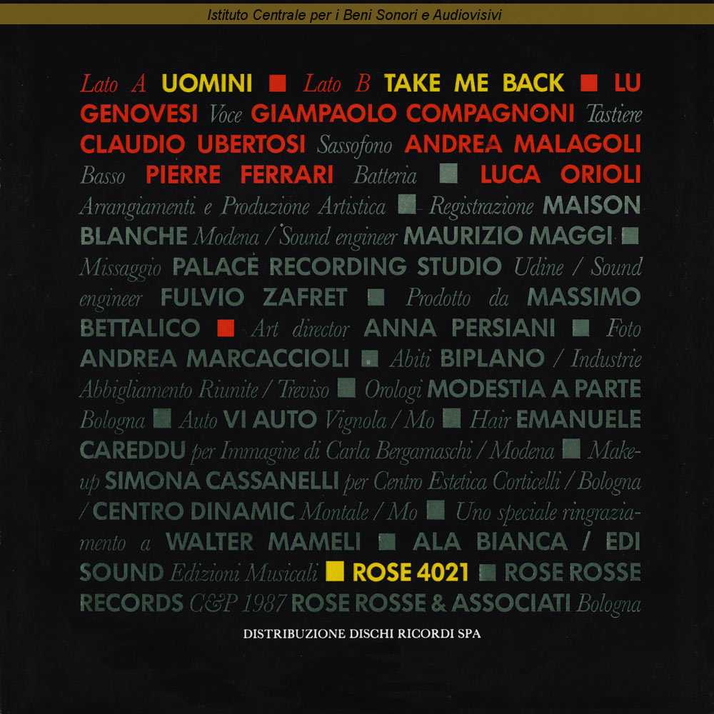 Note: Registrato allo Studio Maison Blanche di Modena da Maurizio Maggi - Missato al Palace Recording Studio di Udine da Fulvio Zafret / Grafica di Anna Persiani - Fotografia di Andrea Marcaccioli / Distribuito da Dischi Ricordi - Milano / Formazione: Giampaolo Compagnoni - tastiere; Pierre Ferrari - batteria; Lu Genovesi - voce; Andrea Malagoli - basso; Claudio Ubertosi - sassofono