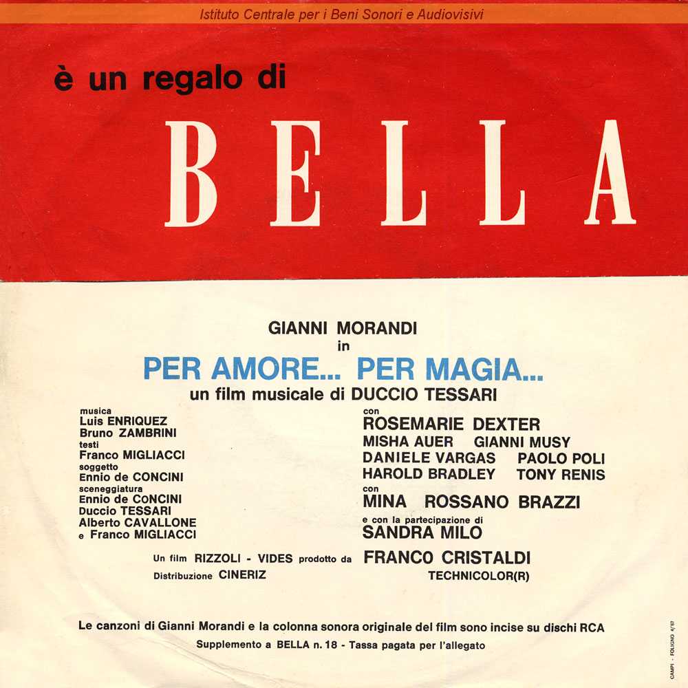Note: Disco abbinato in omaggio alla rivista "Bella" (n.18, 01.05.1967) contenente interventi parlati di Gianni Morandi che presenta il suo ultimo film ("Per amore... per magia" - Duccio Tessari, 1967) e brevi estratti di alcune delle canzoni presenti nella colonna sonora del film / Distribuito da RCA Italiana - Roma