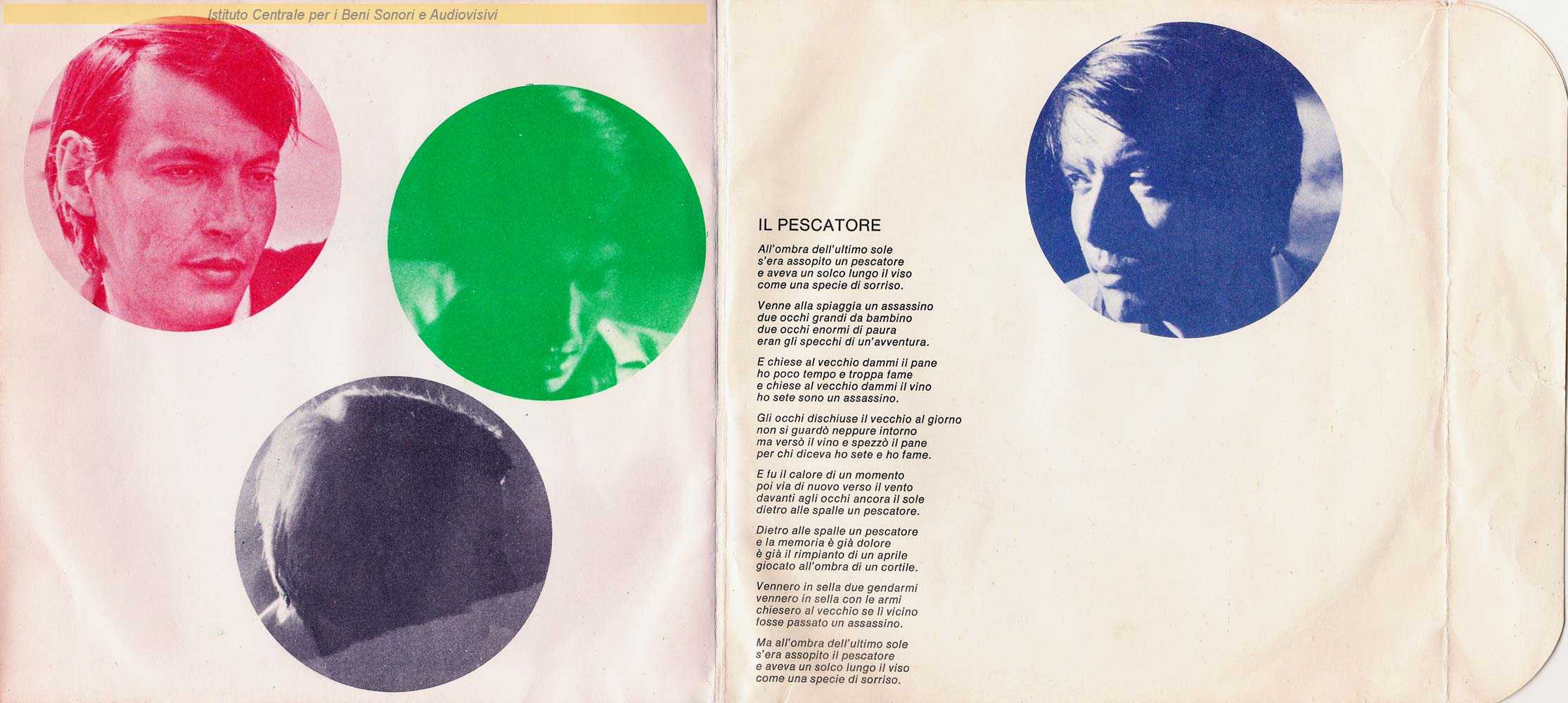 Note: Copertina apribile a libretto (con bandella ripiegata sul lato destro per consentire l'estrazione del disco) con fotografie dell'artista e il testo di "Il pescatore" - In una successiva ristampa la bandella viene eliminata e l'estrazione del disco avviene dal centro, con diversa disposizione delle fotografie - In un'ultima ristampa la copertina non è apribile / Ristampato nel Dicembre 1970 da Produttori Associati (PA 3211) con copertina identica, ma con scritte differenti, e con diversa etichetta