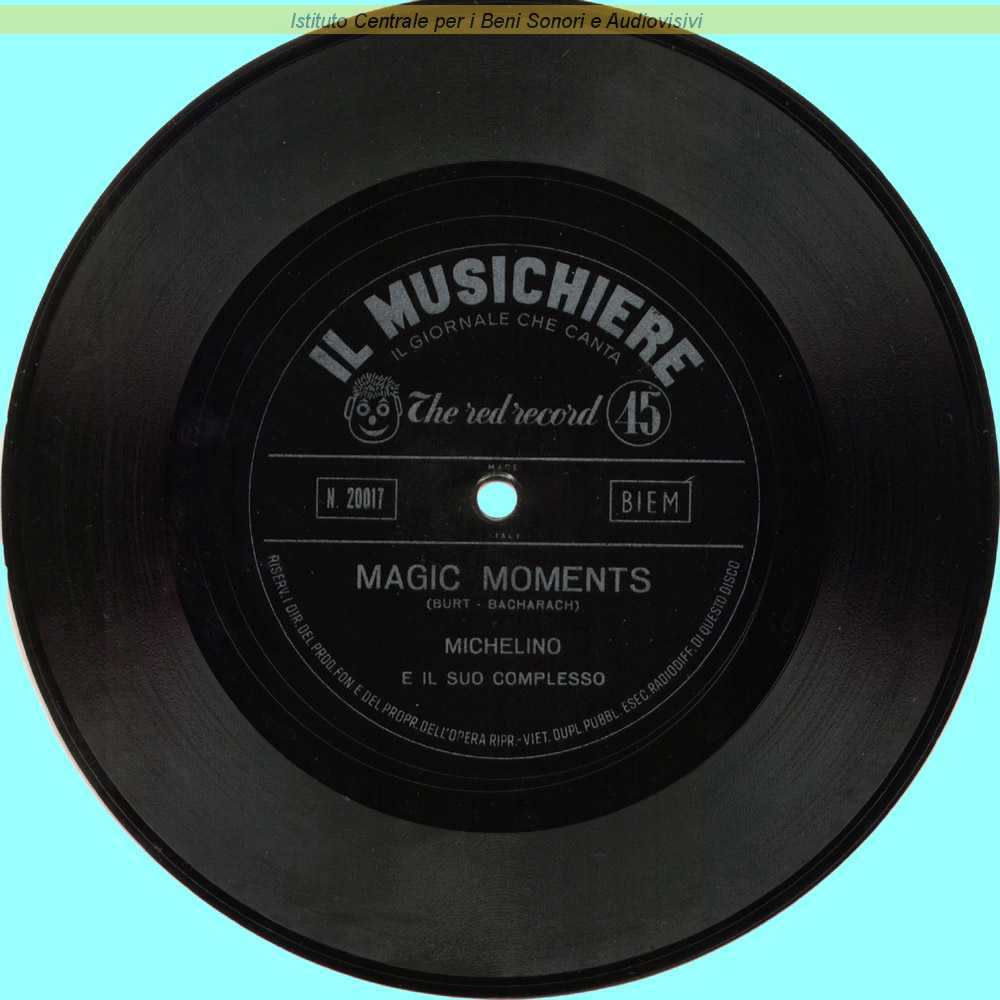 Note: Si tratta di un disco di plastica colorata morbida e flessibile, tecnicamente definito "flexi", allegato al n.28 della rivista "Il Musichiere" del 16 Luglio 1959 / In etichetta errata indicazione del titolo (Magic Moment) e mancata citazione di Hal David tra gli autori / Michelino è il nome d'arte di Michele Gramazio