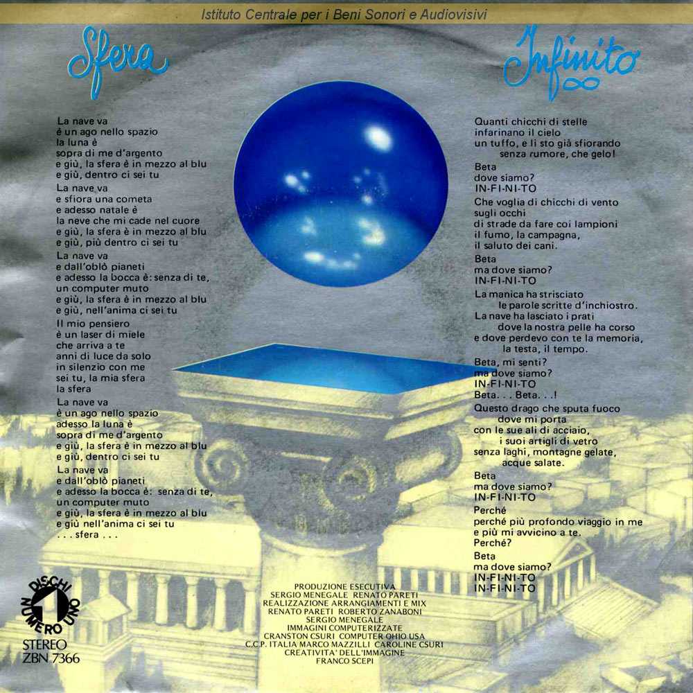 : Sul retro di copertina i testi delle due canzoni / Copertina a cura di Franco Scepi - Immagini computerizzate di Marco Mazzilli e Caroline Csuri / Mixato da Sergio Menegale, Renato Pareti e Roberto Zanaboni / Distribuito da RCA Italiana - Roma