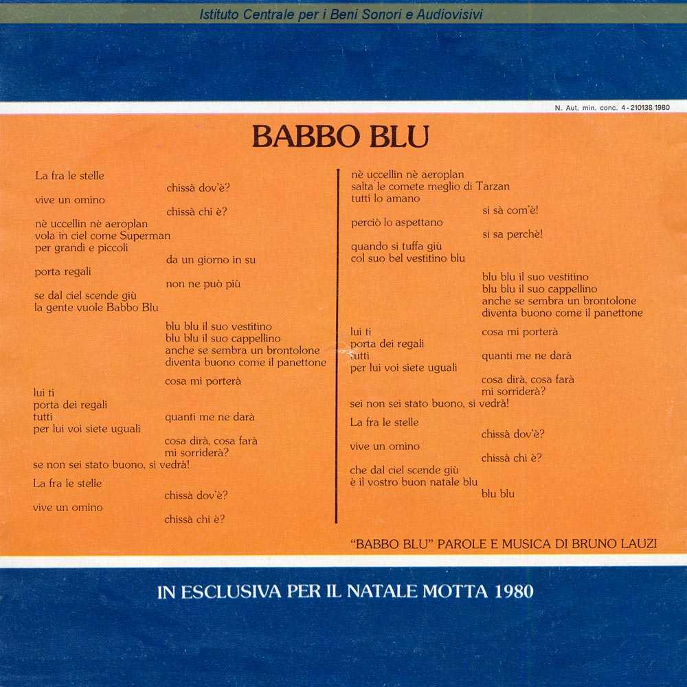 Note: In esclusiva per il Natale Motta 1980 / Si tratta di un disco di plastica morbida e flessibile, tecnicamente definito "flexi", inciso ad una sola facciata, con un'immagine fotografica impressa sul lato A e i crediti del brano sul lato B - Non in vendita nei circuiti commerciali abituali ma distribuito in omaggio per acquisti dei prodotti dell'azienda Motta / Il disco è privo di indicazioni riguardanti le matrici, il numero di catalogo e l'etichetta / Distribuito da SIDALM - Milano