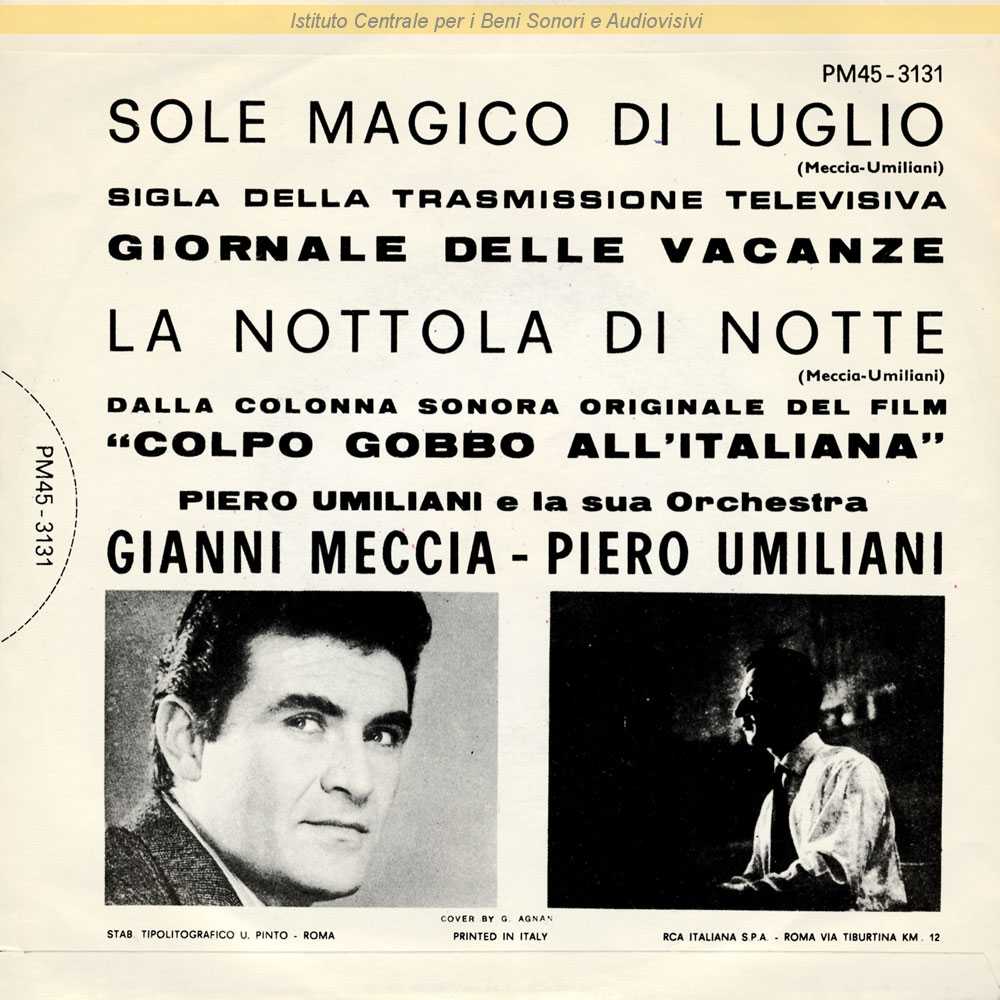: Lato A: Sigla della trasmissione televisiva "Giornale delle vacanze" - Lato B: dalla colonna sonora del film "Colpo gobbo all'italiana" (Lucio Fulci, 1962) / Disegno di copertina di G. Agnan / Distribuito da RCA Italiana - Roma