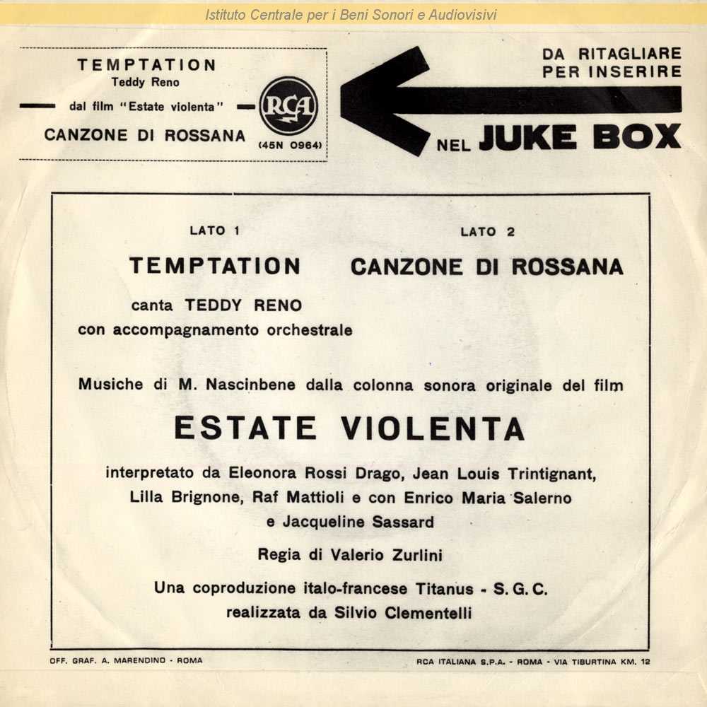 Note: Ambedue i brani dalla colonna sonora del film "Estate violenta" (Valerio Zurlini, 1959) / In copertina il lato B, solo strumentale, è indicato come "Canzone di Rossana" e in etichetta non è ufficialmente accreditato a nessun esecutore / Distribuito da RCA Italiana - Roma