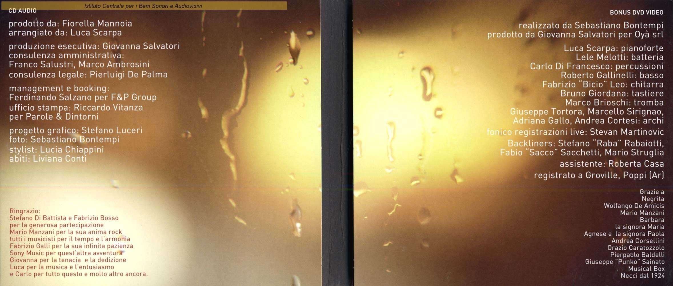 Autori: Ivano Fossati Musicisti: Carlo Di Francesco (percussioni) , Roberto Gallinelli (basso) , Bruno Giordana (tastiere) , Fabrizio "Bicio" Leo (chitarre) , Lele Melotti (batteria) , Luca Scarpa (arrangiamento archi) , Luca Scarpa (pianoforte, tastiere) Orchestra: Fabio Gurian Edizioni: Il Volatore