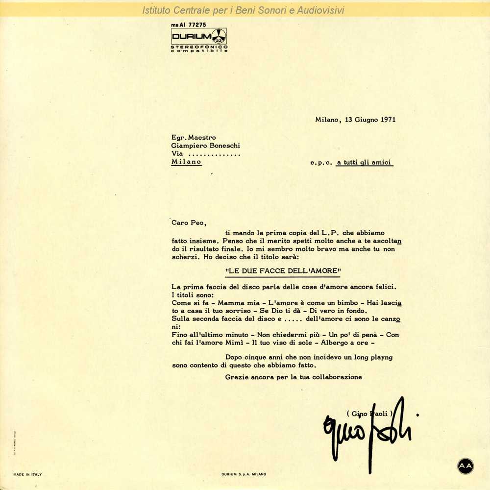 Autori: Antonio Balducci, Gino Paoli Edizioni: Durium , Senza Fine