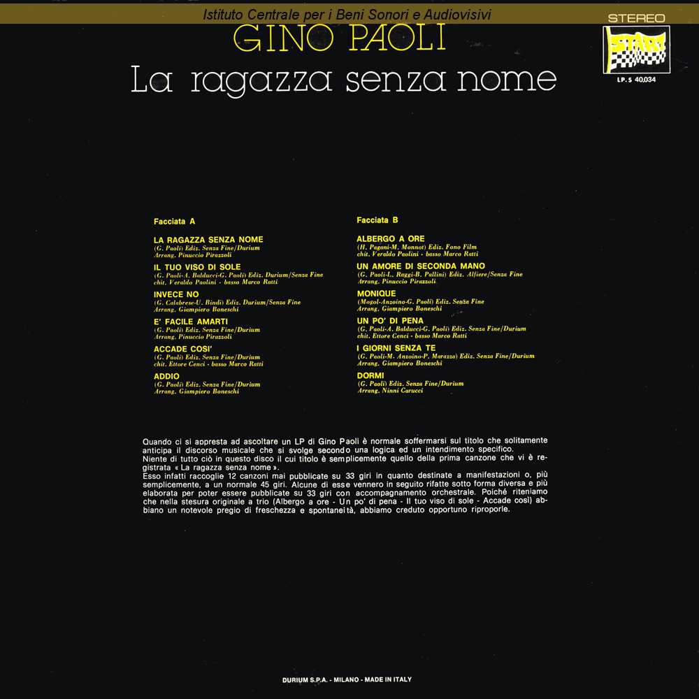 Autori: Umberto Bindi, Giorgio Calabrese Arrangiatori: Giampiero Boneschi Edizioni: Durium , Senza Fine