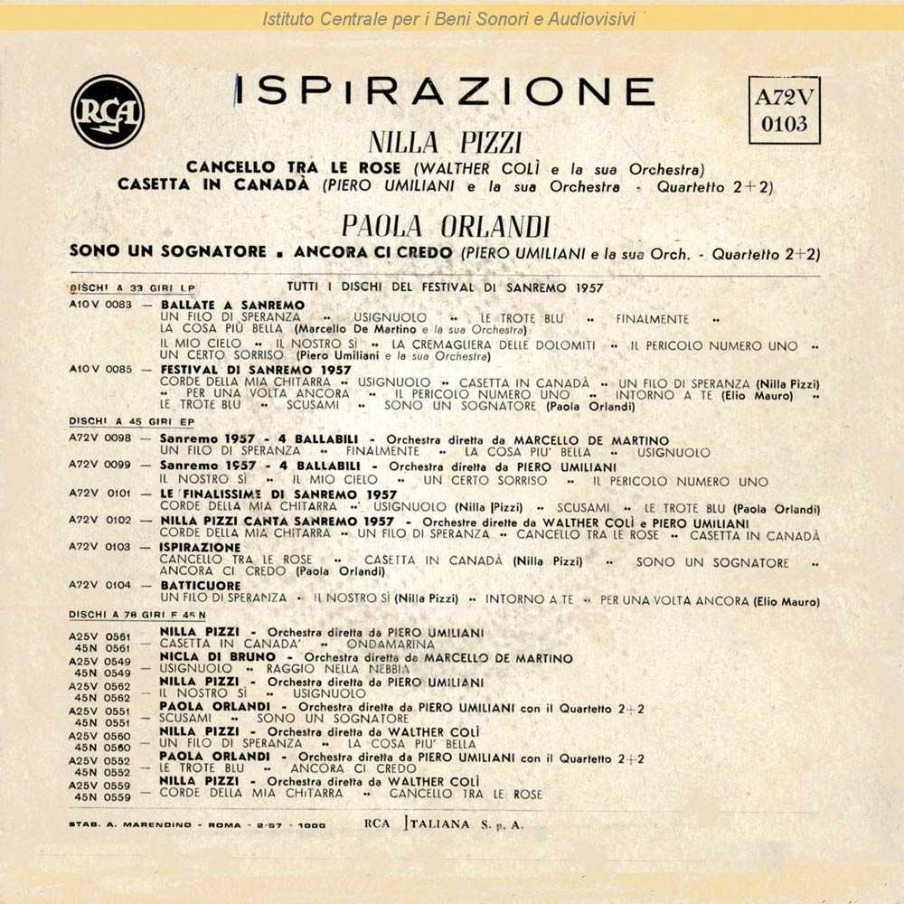 Interpreti: Nilla Pizzi Autori: Umberto Bertini, Marino De Paolis Orchestra: Walter Colì
