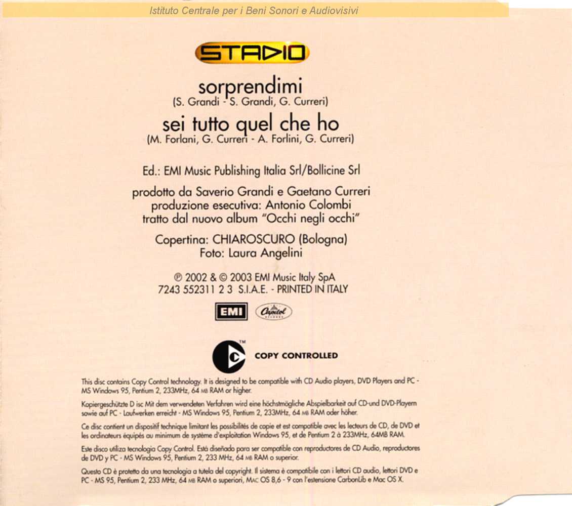 Note: Fotografia di Laura Angelini - Grafica dello Studio Chiaroscuro / Andrea Fornili è erroneamente citato tra gli autori come A. Forlini / Distribuito da EMI Music Italy / Formazione: Gaetano Curreri, Roberto Drovandi, Andrea Fornili, Giovanni Pezzoli