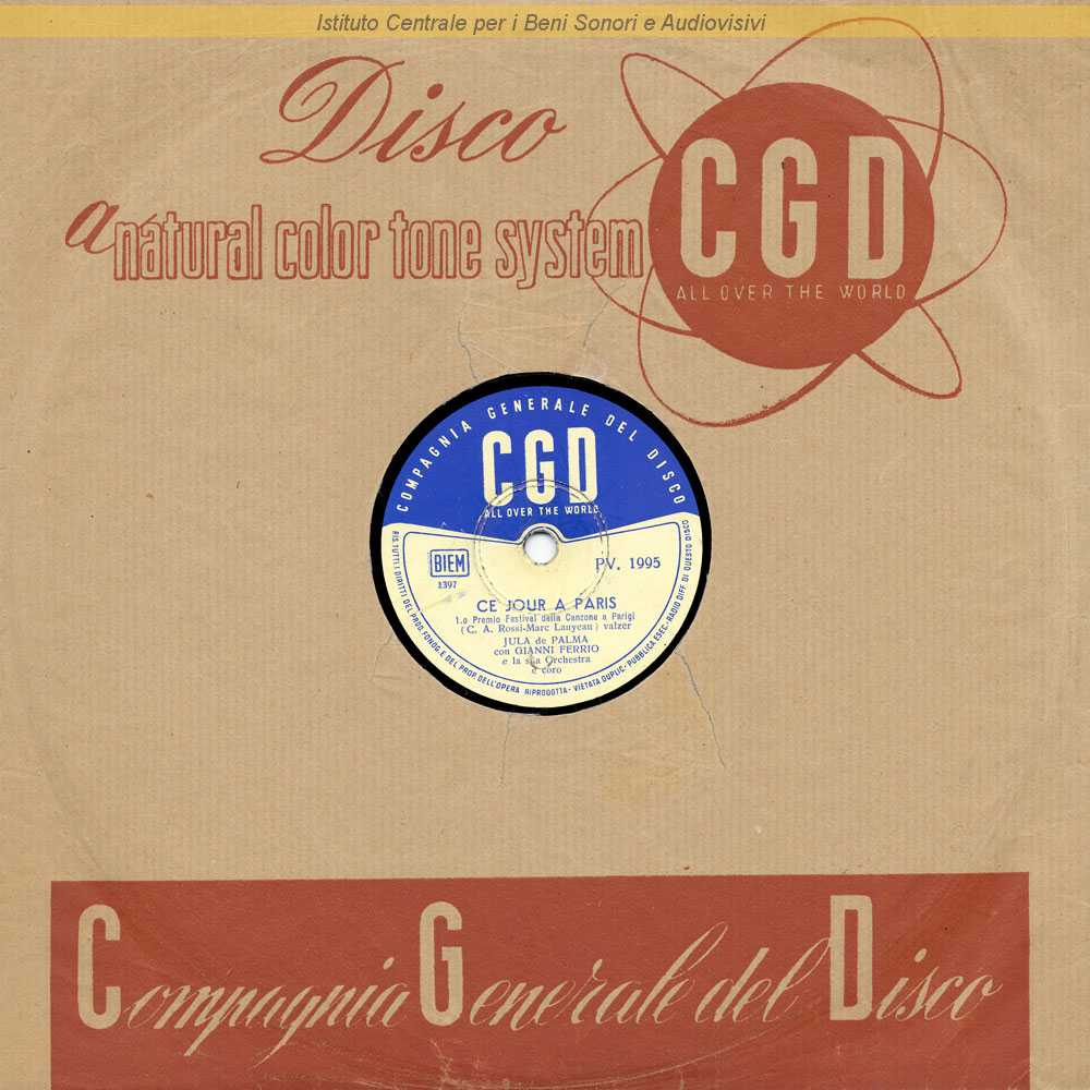 : Sul bordo interno del lato A la matrice è indicata con il numero 1399 / "Ce jour a Paris" primo premio al Festival della Canzone a Parigi / Stampato da Compagnia Generale del Disco
