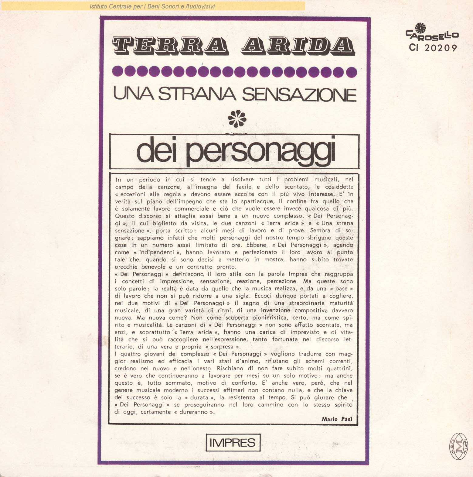 : Data matrici: 23 Settembre / Copertina di Lorenzo Longhin / Sul retro copertina nota di presentazione del disco firmata da Mario Pasi
